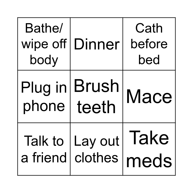 This bingo card has a free space and 8 words: Mace, Cath before bed, Dinner, Talk to a friend, Bathe/ wipe off body, Take meds, Plug in phone and Lay out clothes.