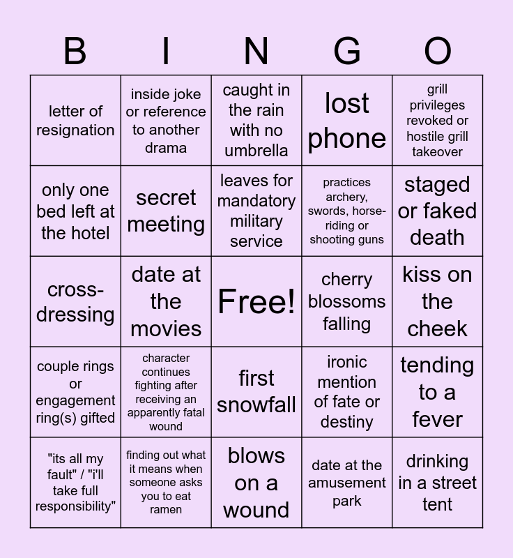 This bingo card has a free space and 136 words: "don't go", "i can't accept your feelings", "i don't feel the same way", "i like you", "i love you", "i missed you", "its all my fault" / "i'll take full responsibility", "let's be friends", "let's break up", "so what's your plan?", "we can't be friends", "we never had this conversation", accusation of being a pervert, agree to end fake or pretend relationship, agree to fake or pretend relationship, amnesia, apologizes for last night's drunken mistake, bath or shower scene, birth secret, blind date, blows on a wound, caught in the rain and shared an umbrella, caught in the rain with no umbrella, caught in the romantic act, chaebol attempts to bribe undesirable romantic interest of family member, character continues fighting after receiving an apparently fatal wound, cherry blossoms falling, clutches chest or heart, contract dating or marriage, cooking together, couple rings or engagement ring(s) gifted, cross-dressing, date at the amusement park, date at the movies, date at the outdoor market, date shopping, date to eat street food, dinner or drinks bought for the entire restaurant, dramatic suspension in space, time, or water, drink thrown in the face, drinking in a street tent, drunken piggy back ride, dying wish, embarrassing stomach growl, fainting or passing out, finding out what it means when someone asks you to eat ramen, fireworks (literal, not figurative), first or second lead discovers shared childhood history / trauma, first snowfall, fist fight, foot chase, forehead flick, forehead kiss, forgets wallet, cash, credit cards, gambling, gift of flowers, gift of jewelry, gift of supplements, gifted candy or sweets, gifted clothing or outerwear, grabbed by the wrist, grill privileges revoked or hostile grill takeover, hiding in a closet, hit with a bag or purse, hold hands, hospital visit for minor condition, hugged from behind, humidifiers next to sick people, imprisonment, inside joke or reference to another drama, ironic mention of fate or destiny, kiss on the cheek, kiss on the mouth, kneeling apology demanded, kneeling apology performed, last will and testament, leaves for mandatory military service, led away by the hand, letter of resignation, loaned jacket or scarf, looks at old photos, lost phone, marriage proposal accepted, marriage proposal declined, matching couple clothing, meeting with a disapproving potential in-law or family member, mention of "drawing a line" or creating distance between characters, mention of soulmates, musical cameo of popular performer, north seoul tower visible in the scene, one-sided hug, only one bed left at the hotel, oops i spilled something on your clothes, oops i tripped and fell into your arms!, oops i tripped and fell on to your lips!, orders iced americano, parent delivers side dishes, pinky swear, plays tambourine at kareoke, plays video, arcade or street fair game, poisoned, practices archery, swords, horse-riding or shooting guns, pulls a item out of a memory box, pulls car over or performs a u-turn on major road, puts an item in a memory box, refuses to apologize, returns from mandatory military service, royals, nobles, or rich folk dressed as regular folk, saved from a car or motorcycle accident, saved from falling into or getting sprayed by water, screams into their pillow or throws a tantrum in bed, secret identity revealed, secret meeting, sent to america (usually a demotion), sent to europe (usually a promotion), sincere mention of fate or destiny, skipping work to hang out, slap across the face, sleeping at a bus stop, sleeping in street / work clothes, sleeps in a sauna, slow-motion missed connection / walk past, split screen with two or more characters at the same time, staged or faked death, subway / quiznos, sword fight, takes a supplement, tending to a fever, threshold-style carry, time skip, traditional korean dress in a non-historical (or fantasy) drama, treason or coup, watches a drama on tv in the drama, wedding dress shopping or suit fitting, wingman / wingwoman assist and wound bandaged.