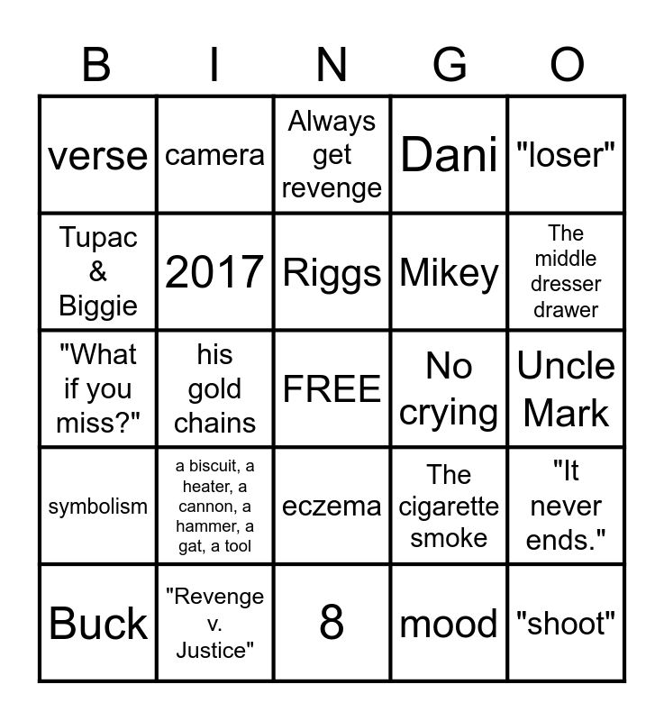 This bingo card has a free space and 24 words: a biscuit, a heater, a cannon, a hammer, a gat, a tool, "Revenge v. Justice", Riggs, Buck, "loser", verse, Tupac & Biggie, camera, No crying, eczema, Mikey, "What if you miss?", The cigarette smoke, "It never ends.", 2017, mood, Uncle Mark, Always get revenge, The middle dresser drawer, his gold chains, "shoot", symbolism, Dani and 8.