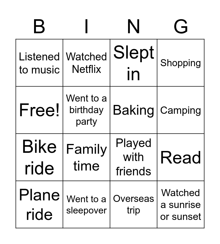 This bingo card has 16 words: Went to a sleepover, Read, Slept in, Listened to music, Bike ride, Watched Netflix, Played with friends, Overseas trip, Free!, Went to a birthday party, Plane ride, Shopping, Family time, Camping, Baking and Watched a sunrise or sunset.