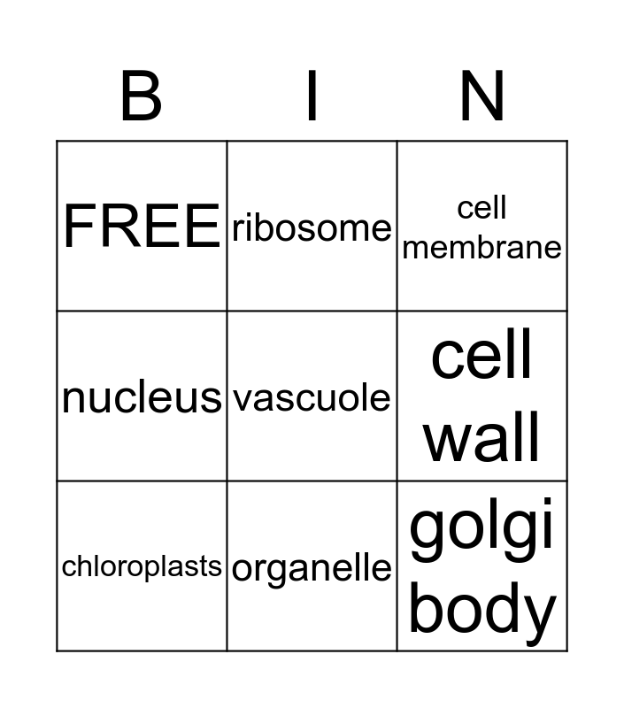This bingo card has a free space and 8 words: cell wall, cell membrane, ribosome, chloroplasts, FREE, golgi body, nucleus and organelle.