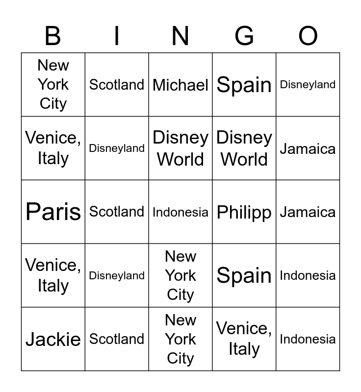 This bingo card has 34 words: Paris, Scotland, Free!, Disney World, Jamaica, Venice, Italy, Disneyland, New York City, Spain, Indonesia, Paris, Scotland, New York City, Nashville, Jamaica, Venice, Italy, Disneyland, Disney World, Indonesia, Spain, Jackie, Tricia, Michael, Philipp, Paris, Scotland, Disney World, Jamaica, Disneyland, New York City, Spain, Indonesia, Venice, Italy and Nashville.