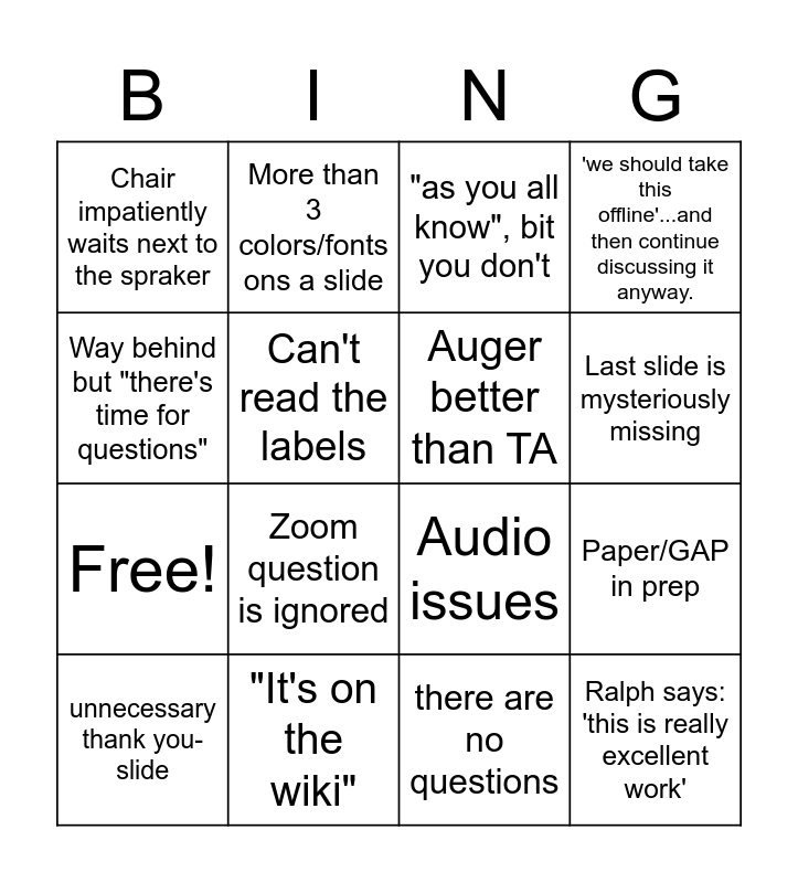 This bingo card has 20 words: Paper/GAP in prep, Endless discussion, "as you all know", bit you don't, 10+ minutes over time, unnecessary thank you-slide, Way behind but "there's time for questions", "It's on the wiki", Chair impatiently waits next to the spraker, Free!, More than 3 colors/fonts ons a slide, Zoom question is ignored, Audio issues, Can't read the labels, Ralph says: 'this is really excellent work', Auger better than TA, A phone goes off, Last slide is mysteriously missing, 'we should take this offline'...and then continue discussing it anyway., there are no questions and 'more a comment than a question'.