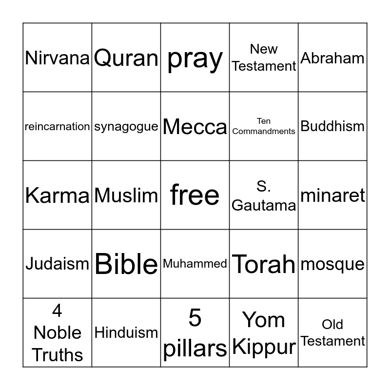 This bingo card has a free space and 24 words: Bible, Hinduism, Mecca, 4 Noble Truths, Abraham, Nirvana, reincarnation, Quran, S. Gautama, Muhammed, Ten Commandments, Karma, Torah, mosque, synagogue, Yom Kippur, minaret, pray, Buddhism, Muslim, Old Testament, Judaism, New Testament and 5 pillars.