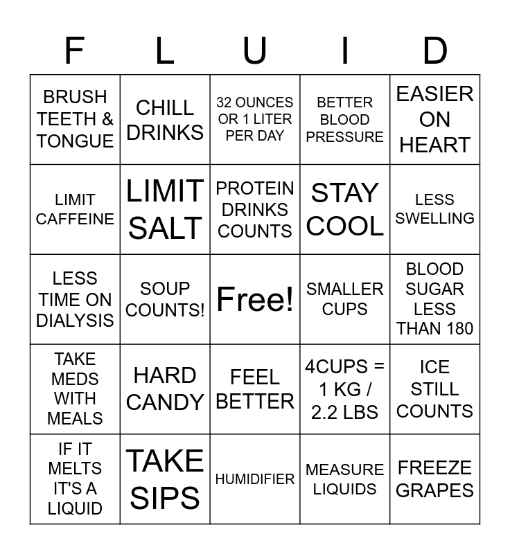 This bingo card has a free space and 29 words: IF IT MELTS IT'S A LIQUID, MOUTHWASH WITH NO ALCOHOL, SOUP COUNTS!, CHEW SUGAR-FREE GUM, BRUSH TEETH & TONGUE, 32 OUNCES OR 1 LITER PER DAY, LIMIT SALT, HARD CANDY, SMALLER CUPS, TAKE SIPS, BLOOD SUGAR LESS THAN 180, FREEZE GRAPES, HUMIDIFIER, MEASURE LIQUIDS, LESS SWELLING, LESS HOSPITAL VISITS, FEEL BETTER, TAKE MEDS WITH MEALS, EASIER ON HEART, LESS TIME ON DIALYSIS, 4CUPS = 1 KG / 2.2 LBS, LEMON, STAY COOL, LIMIT CAFFEINE, BETTER BLOOD PRESSURE, CHILL DRINKS, ICE STILL COUNTS, PROTEIN DRINKS COUNTS and SET TIME.