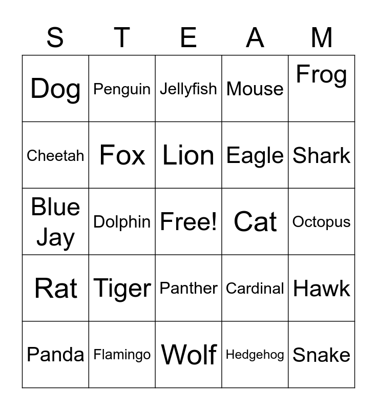 This bingo card has a free space and 24 words: Tiger, Flamingo, Lion, Panda, Frog, Dog, Cheetah, Penguin, Cat, Panther, Eagle, Blue Jay, Cardinal, Hawk, Fox, Hedgehog, Octopus, Jellyfish, Shark, Dolphin, Snake, Rat, Mouse and Wolf.