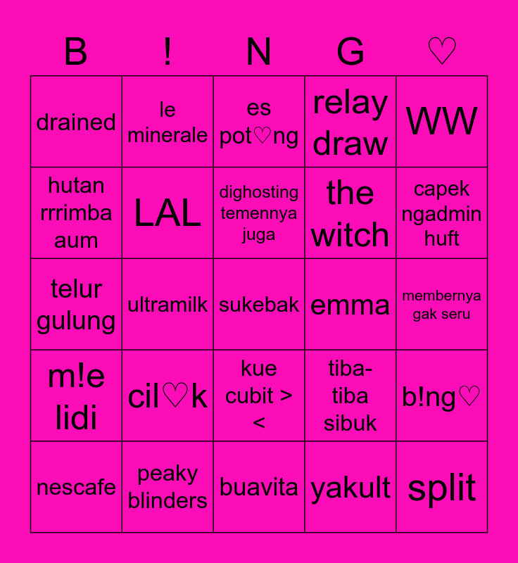 This bingo card has a free space and 24 words: cil♡k, peaky blinders, dighosting temennya juga, nescafe, WW, drained, hutan rrrimba aum, le minerale, emma, kue cubit ><, the witch, telur gulung, tiba-tiba sibuk, b!ng♡, LAL, yakult, membernya gak seru, es pot♡ng, capek ngadmin huft, ultramilk, split, m!e lidi, relay draw and buavita.