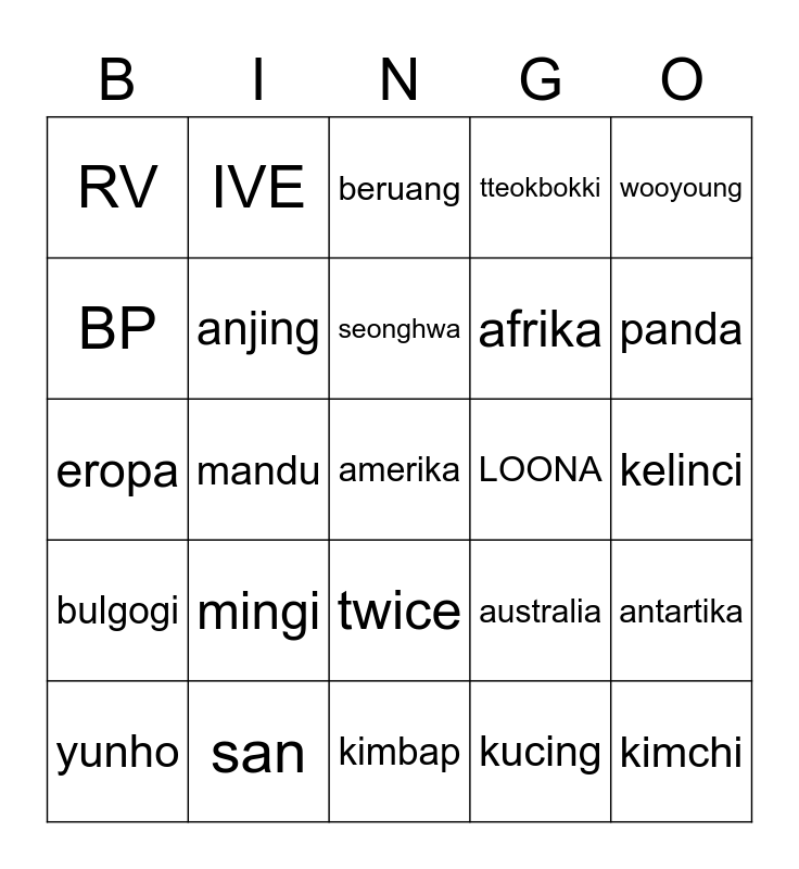 This bingo card has a free space and 24 words: mingi, san, seonghwa, yunho, wooyoung, RV, BP, IVE, LOONA, twice, afrika, eropa, australia, antartika, anjing, kucing, kelinci, beruang, panda, mandu, kimchi, bulgogi, tteokbokki and kimbap.