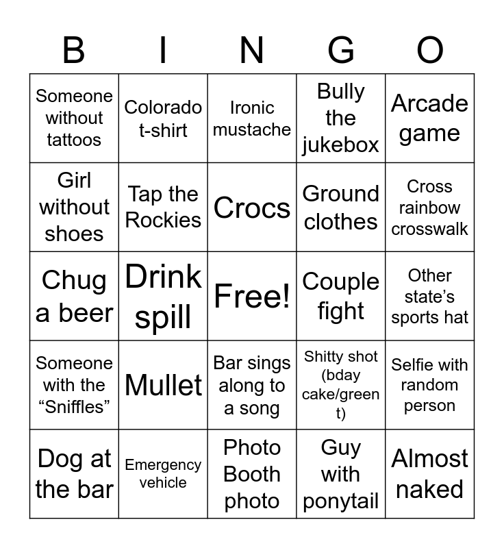This bingo card has a free space and 27 words: Shitty shot (bday cake/green t), Too drunk in the bathroom, Ground clothes, Photo Booth photo, Girl without shoes, Ironic mustache, Colorado t-shirt, Someone with the “Sniffles”, Couple fight, Selfie with random person, Chug a beer, Bully the jukebox, Dog at the bar, Emergency vehicle, Cross rainbow crosswalk, Sidewalk art, Tap the Rockies, Crocs, Mullet, Someone without tattoos, Other state’s sports hat, Guy with ponytail, Drink spill, Almost naked, Bar sings along to a song, Arcade game and Feeling old.