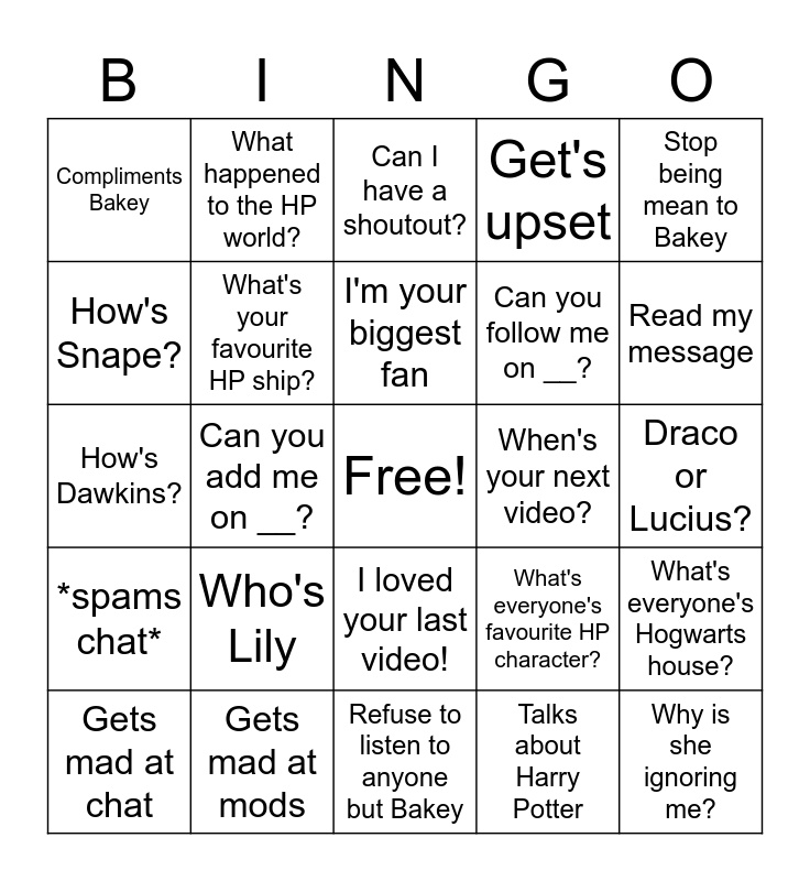 This bingo card has a free space and 24 words: Who's Lily, Gets mad at mods, I'm your biggest fan, Gets mad at chat, Stop being mean to Bakey, Compliments Bakey, How's Snape?, What happened to the HP world?, When's your next video?, I loved your last video!, Can you follow me on __?, How's Dawkins?, What's everyone's favourite HP character?, What's everyone's Hogwarts house?, What's your favourite HP ship?, Talks about Harry Potter, Draco or Lucius?, Can I have a shoutout?, Read my message, Can you add me on __?, Why is she ignoring me?, *spams chat*, Get's upset and Refuse to listen to anyone but Bakey.