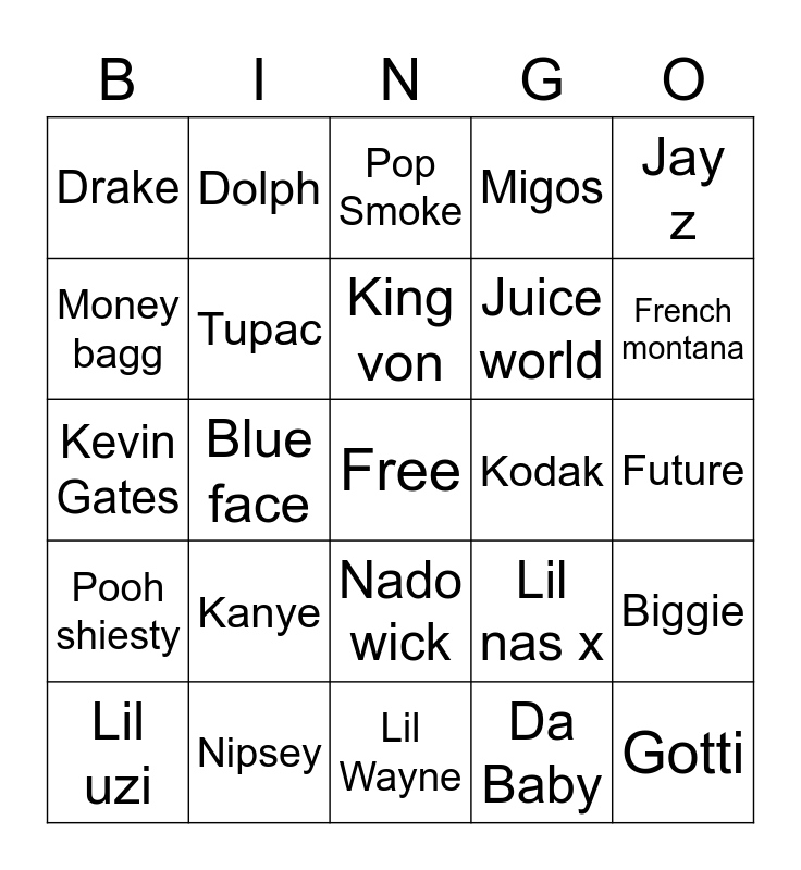 This bingo card has a free space and 24 words: Kanye, Nipsey, King von, Lil uzi, Jay z, Drake, Money bagg, Dolph, Kodak, Nado wick, Juice world, Kevin Gates, Lil nas x, Biggie, Tupac, Da Baby, Future, Pop Smoke, French montana, Blue face, Gotti, Pooh shiesty, Migos and Lil Wayne.