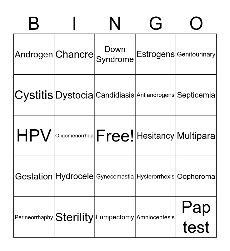 This bingo card has a free space and 24 words: Hydrocele, Sterility, Candidiasis, Perineorrhaphy, Genitourinary, Androgen, Cystitis, Chancre, Hesitancy, Gynecomastia, Antiandrogens, HPV, Hysterorrhexis, Oophoroma, Dystocia, Amniocentesis, Multipara, Down Syndrome, Septicemia, Oligomenorrhea, Pap test, Gestation, Estrogens and Lumpectomy.