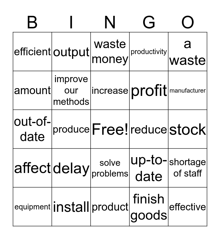 This bingo card has a free space and 24 words: delay, install, increase, equipment, a waste, efficient, amount, output, reduce, solve problems, profit, out-of-date, up-to-date, shortage of staff, improve our methods, finish goods, stock, waste money, manufacturer, produce, effective, affect, productivity and product.