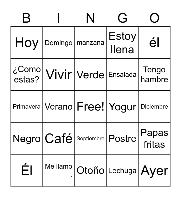 This bingo card has a free space and 105 words: estación, agua, él, enero, café, ella, febrero, tengo hambre, nosotros, marzo, estoy llena, ellos/as, abril, pollo, ustedes, mayo, manzana, vivir, junio, postre, saltchica, agosto, lechuga, yogur, Agua, Café, Tengo hambre, Estoy llena, Pollo, Manzana, Postre, Lechuga, Tener, Querer, Necesitar, Tengo 10 años, Amarillo, Azul, Verde, Me llamo _______., Morado, Negro, Blanco, ¿Como estas?, ¿Cuantos años tienes?, Hoy, Mañana, Ayer, Durazno, Yo, Tú, Estación, Enero, Febrero, Marzo, Abril, Mayo, Junio, Agosto, Septiembre, Diciembre, Lunes, Martes, Miércoles, Jueves, Viernes, Sábado, Domingo, Primavera, Verano, Otoño, Invierno, Maíz, Papas, Zanahoria, Pan, Arroz, Leche, Él, Ella, Nosotros/as, Ellos/as, Ustedes, Vivir, Salchicha, Yogur, Que, Quien, Porque, Donde, Como, Cuando, Cuanto hay, Uvas, Papas fritas, Hamburguesa, Fruta, Vegetales, Ensalada, Galleta, Mi color favorito es _____., Día, Mes, Año and Semana.