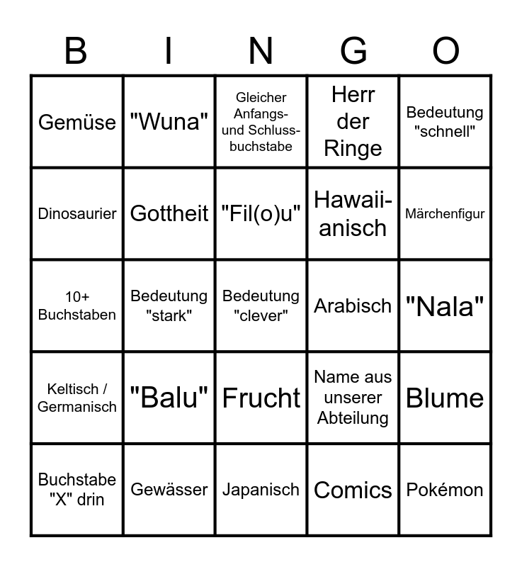 This bingo card has 25 words: "Balu", Japanisch, "Fil(o)u", Buchstabe "X" drin, Bedeutung "schnell", Gemüse, Dinosaurier, "Wuna", Arabisch, Frucht, Hawaii-anisch, 10+ Buchstaben, Name aus unserer Abteilung, Blume, Gottheit, Pokémon, "Nala", Gleicher Anfangs- und Schluss-buchstabe, Märchenfigur, Bedeutung "stark", Bedeutung "clever", Gewässer, Keltisch / Germanisch, Herr der Ringe and Comics.