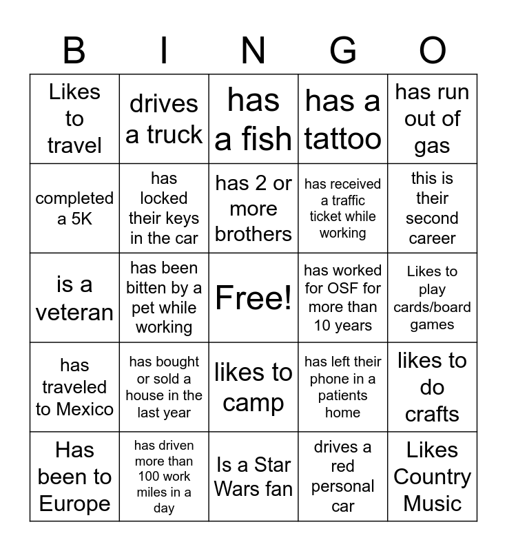 This bingo card has a free space and 34 words: has only 1 sister, drives a red personal car, has a furry pet, likes sushi, has traveled to Mexico, has locked their keys in the car, has run out of gas, Has been to Europe, drives a truck, would say pizza is their favorite food, has 2 or more brothers, has a fish, Played a sport in high school, Played a sport in college, has worked for OSF for more than 10 years, this is their second career, has driven more than 100 work miles in a day, is a veteran, has bought or sold a house in the last year, has left their phone in a patients home, likes to camp, has seen a live concert in the last 3 months, Likes to travel, Likes to play cards/board games, Is a Star Wars fan, Likes Country Music, has a tattoo, Wears glasses or contacts, has received a traffic ticket while working, completed a 5K, sends Christmas cards every year, has been bitten by a pet while working, likes to do crafts and has been lost trying to find a patients home.