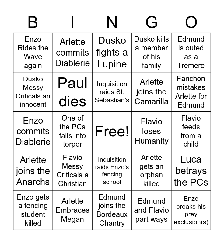 This bingo card has a free space and 24 words: Flavio Messy Criticals a Christian, Arlette Embraces Megan, Inquisition raids St. Sebastian's, Enzo gets a fencing student killed, Edmund is outed as a Tremere, Enzo Rides the Wave again, Dusko Messy Criticals an innocent, Arlette commits Diablerie, Flavio loses Humanity, Inquisition raids Enzo's fencing school, Arlette joins the Camarilla, Enzo commits Diablerie, Arlette gets an orphan killed, Luca betrays the PCs, Paul dies, Edmund and Flavio part ways, Flavio feeds from a child, Dusko fights a Lupine, Fanchon mistakes Arlette for Edmund, One of the PCs falls into torpor, Enzo breaks his prey exclusion(s), Arlette joins the Anarchs, Dusko kills a member of his family and Edmund joins the Bordeaux Chantry.