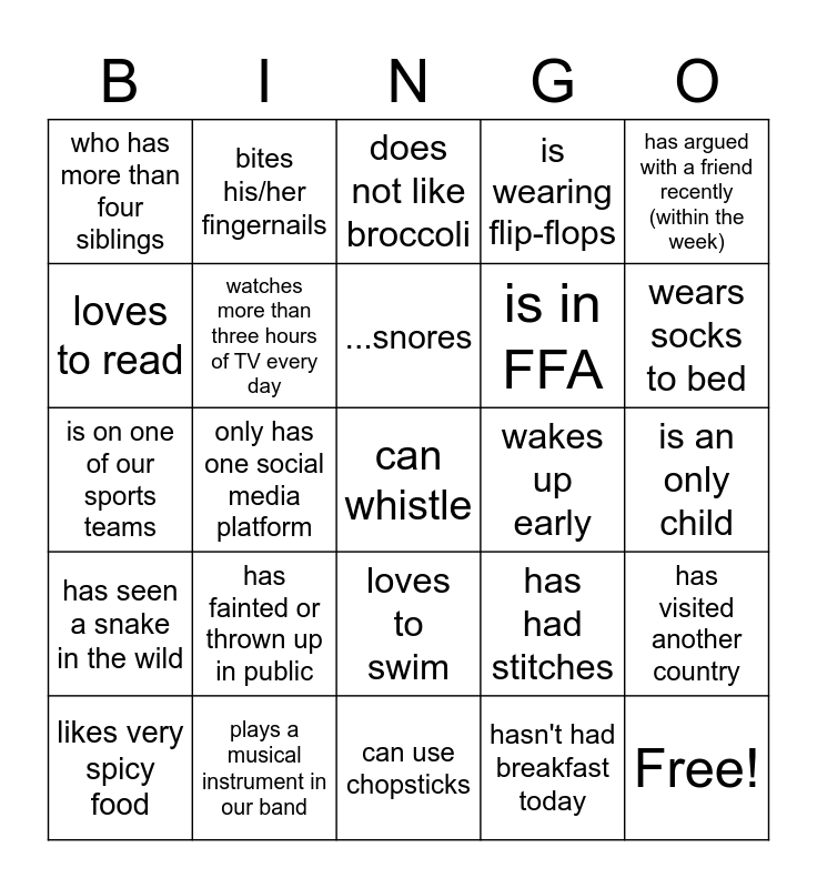 This bingo card has 34 words: Free!, hasn't had breakfast today, enjoys math, is a couch potato, has seen a snake in the wild, watches more than three hours of TV every day, has argued with a friend recently (within the week), likes very spicy food, bites his/her fingernails, was born in January, ...snores, does not like broccoli, drank coffee this morning, is afraid of spiders, wakes up early, wears socks to bed, plays a musical instrument in our band, is on one of our sports teams, has fainted or thrown up in public, has had stitches, loves to swim, has the most letters in their last name, who has more than four siblings, is an only child, can use chopsticks, can whistle, is wearing flip-flops, is in ASB, is in FFA, loves to read, hates to read, only has one social media platform, has visited another country and speaks a foreign language other than Spanish.