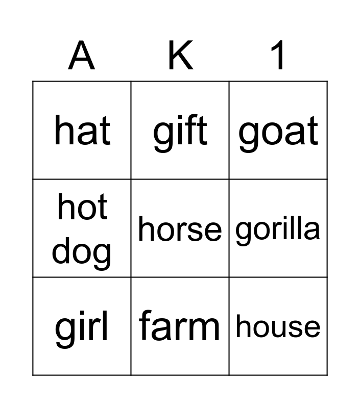 This bingo card has a free space and 8 words: gorilla, goat, gift, girl, hat, house, hot dog and farm.