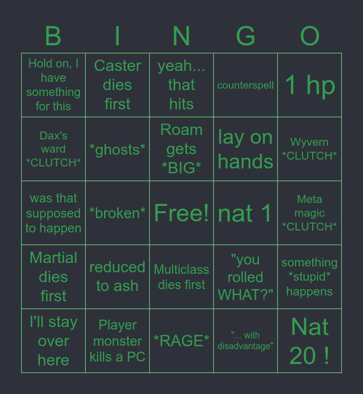 This bingo card has a free space and 57 words: Combo move, I'll stay over here, FIREBALL, Hold on, I have something for this, *RAGE*, hit from 100+ ft away, *ghosts*, hit the ceiling, lay on hands, *dead*, counterspell, quickened spell, action surge, sneak attack, "I'm out.. of spells", uh oh, 1 hp, *broken*, help, Nat 20 !, nat 1, I didn't prepare for that, "you rolled WHAT?", yeah... that hits, "wait for it", Roam gets *BIG*, Roam too angry to die, Shogeki falls from great height, Wyvern *CLUTCH*, Wyvern Betrayal!, BIG SMITE, *LORE*, Robin's aura *CLUTCH*, Maroth flies, Meta magic *CLUTCH*, Dax's ward *CLUTCH*, Voice of *Authority*, was that supposed to happen, can you read me..., Martial dies first, Caster dies first, Multiclass dies first, single class dies first, *RESISTED*, Critical Hit, Maurice *CLUTCH*, reduced to ash, Player monster kills a PC, 50+ damage one turn, cameo, emotional damage, "... with disadvantage", a plan goes wrong, *plans*, plot twist, something *stupid* happens and pc hurts themselves.