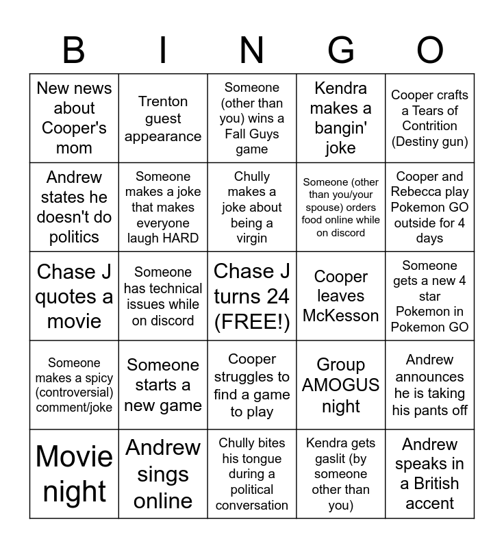 This bingo card has a free space and 24 words: Someone starts a new game, Andrew sings online, Chully makes a joke about being a virgin, Movie night, Cooper crafts a Tears of Contrition (Destiny gun), New news about Cooper's mom, Andrew states he doesn't do politics, Trenton guest appearance, Cooper leaves McKesson, Cooper struggles to find a game to play, Someone (other than you/your spouse) orders food online while on discord, Chase J quotes a movie, Group AMOGUS night, Andrew announces he is taking his pants off, Someone makes a joke that makes everyone laugh HARD, Kendra gets gaslit (by someone other than you), Someone gets a new 4 star Pokemon in Pokemon GO, Someone (other than you) wins a Fall Guys game, Cooper and Rebecca play Pokemon GO outside for 4 days, Someone has technical issues while on discord, Andrew speaks in a British accent, Someone makes a spicy (controversial) comment/joke, Kendra makes a bangin' joke and Chully bites his tongue during a political conversation.