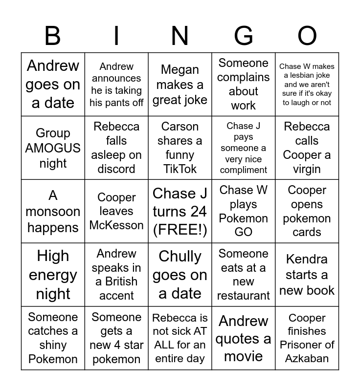 This bingo card has a free space and 24 words: Andrew speaks in a British accent, Someone gets a new 4 star pokemon, Carson shares a funny TikTok, Someone catches a shiny Pokemon, Chase W makes a lesbian joke and we aren't sure if it's okay to laugh or not, Andrew goes on a date, Group AMOGUS night, Andrew announces he is taking his pants off, Chase W plays Pokemon GO, Chully goes on a date, Chase J pays someone a very nice compliment, A monsoon happens, Someone eats at a new restaurant, Kendra starts a new book, Rebecca falls asleep on discord, Andrew quotes a movie, Cooper opens pokemon cards, Megan makes a great joke, Rebecca calls Cooper a virgin, Cooper leaves McKesson, Cooper finishes Prisoner of Azkaban, High energy night, Someone complains about work and Rebecca is not sick AT ALL for an entire day.