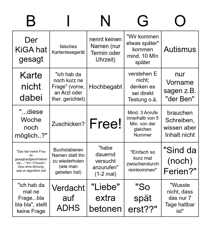 This bingo card has a free space and 35 words: Kind fehlt (Q oder E), "ganz dringend", Hochsensibel, "ich hab da noch kurz ne Frage" (vorne, an Arzt oder ther. gerichtet), "habe dauernd versucht anzurufen" (1-2 mal), "Wir kommen etwas später" kommen mind. 10 MIn später, Karte nicht dabei, "Eher gehts nicht?", Hochbegabt, "Der Desinfektionsspender geht nicht" Hand nur 1 Sek drunter gehalten, "...diese Woche noch möglich..?", Autismus, "Brauche Rezept" meinen VO, Die Lehrerin meint..., Der KiGA hat gesagt, Mind. 3 Anrufe innerhalb von 5 Min. von der gleichen Nummer, "So spät erst??", Zuschicken?, "Das hat meine Frau so gesagt/aufgeschrieben etc...." KV / Freund / Opa ohne Ahnung, was er eigentlich soll, "Wusste nicht, dass das nur 7 Tage haltbar ist", "Einfach so kurz mal zwischendurch reinkommen", "ich hab da mal ne Frage...bla bla bla", stellt keine Frage, "Sind da (noch) Ferien?", Verdacht auf ADHS, nennt keinen Namen (nur Termin oder Uhrzeit), nur Vorname sagen z.B. "der Ben", Karte durch Scheibe schieben (ungefragt), Rezept ohne Vorbestellung "abholen" wollen, verstehen E nicht; denken es sei direkt Testung o.ä., brauchen Schreiben, wissen aber Inhalt nicht, beim Reden aufmerksamkeitsheischend umher gucken, "Liebe" extra betonen, Buchstabieren Namen statt ihn zu wiederholen (wie man gebeten hat), falsches Kartenlesegerät and Eltern: Eigener Name bei "Patient" in Formularen.
