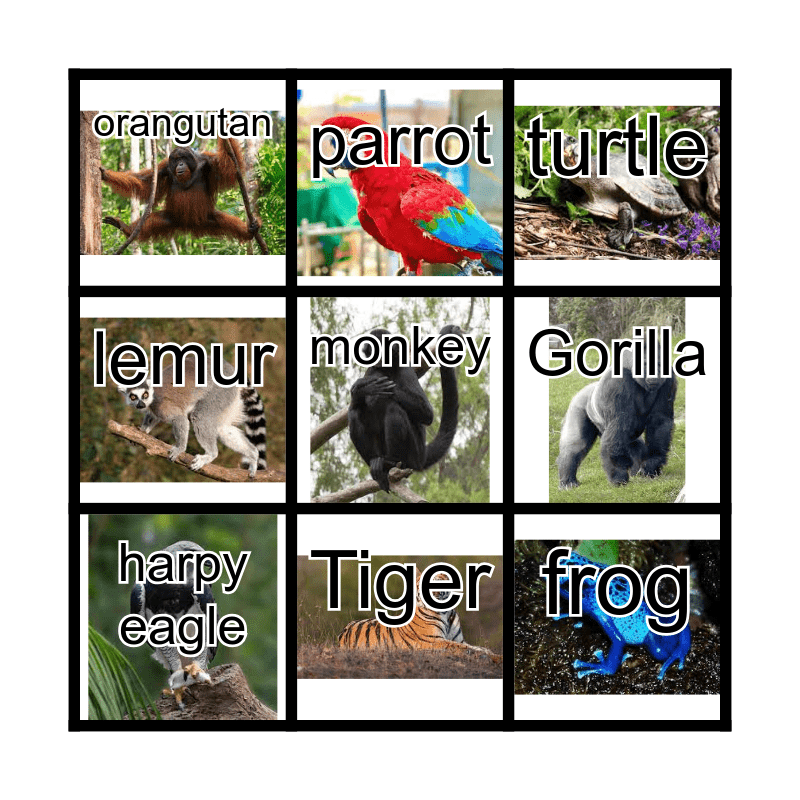This bingo card has 17 images, a free space and 17 words: anteater, lizard, turtle, orangutan, capybara, lemur, caiman, harpy eagle, Tiger, Gorilla, butterfly, jaguar, frog, parrot, toucan, snake and sloth.