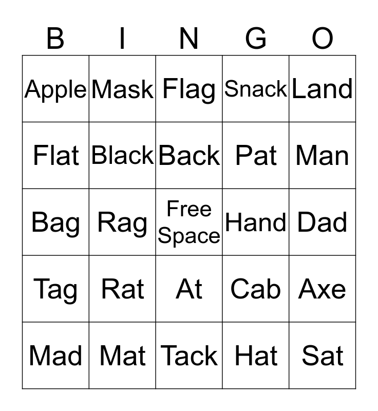 This bingo card has a free space and 24 words: Rat, Mat, Back, Mad, Land, Apple, Flat, Mask, Hand, At, Pat, Bag, Cab, Axe, Black, Hat, Dad, Flag, Man, Rag, Sat, Tag, Snack and Tack.