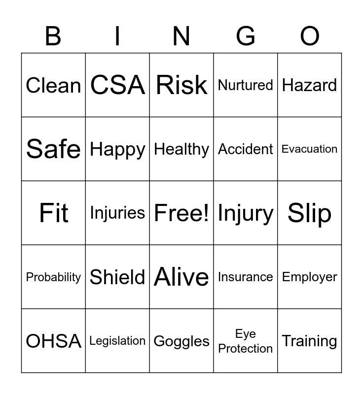 This bingo card has a free space and 35 words: Abled, Energized, Team, Happy, Alive, Nurtured, Safe, Ergonomics, Healthy, Alert, Fit, Hazard, Alarm, Equipment, Clean, Injury, Eye Protection, Injuries, Probability, Training, Insurance, OHSA, Employer, Legislation, Risk, Evacuation, Plan, FirstAid, Accident, Slip, Guarding, Goggles, Shield, CSA and Boots.