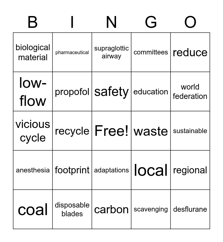 This bingo card has a free space and 52 words: greenhouse gas, desflurane, sevoflurane, carbon, footprint, OR, pharmaceutical, leakage, low-flow, single use, propofol, TIVA, regional, local, Scandinavian, patient, safety, waste, reuse, reduce, recycle, scavenging, biological material, education, research, leader, collaboration, cost savings, world federation, energy, advocate, committees, nitrous oxide, suction, Anna, supraglottic airway, disposable blades, reusable gowns, financial implications, conferences, quality improvement, sustainable, anesthesia, health threat, adaptations, climate change, stability, vicious cycle, pollution, wind, coal and 1.5 C.