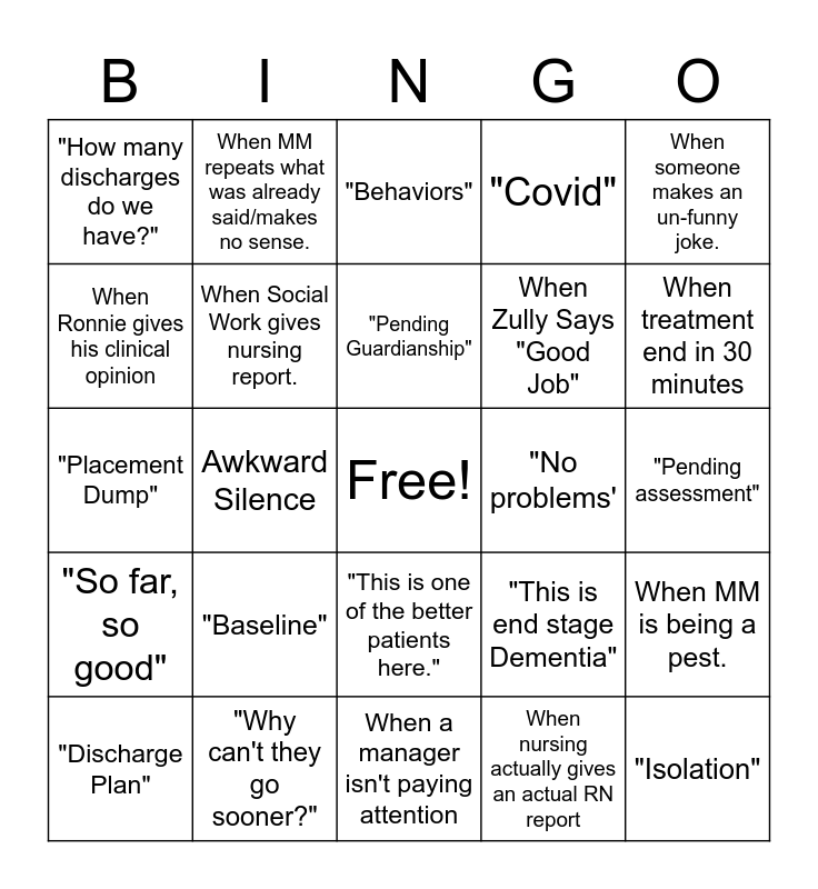 This bingo card has a free space and 24 words: "Baseline", "Why can't they go sooner?", "Pending Guardianship", "Discharge Plan", When someone makes an un-funny joke., "How many discharges do we have?", When Ronnie gives his clinical opinion, When MM repeats what was already said/makes no sense., "No problems', "This is one of the better patients here.", When Zully Says "Good Job", "Placement Dump", "This is end stage Dementia", When MM is being a pest., When Social Work gives nursing report., When nursing actually gives an actual RN report, "Pending assessment", "Behaviors", When treatment end in 30 minutes, Awkward Silence, "Isolation", "So far, so good", "Covid" and When a manager isn't paying attention.
