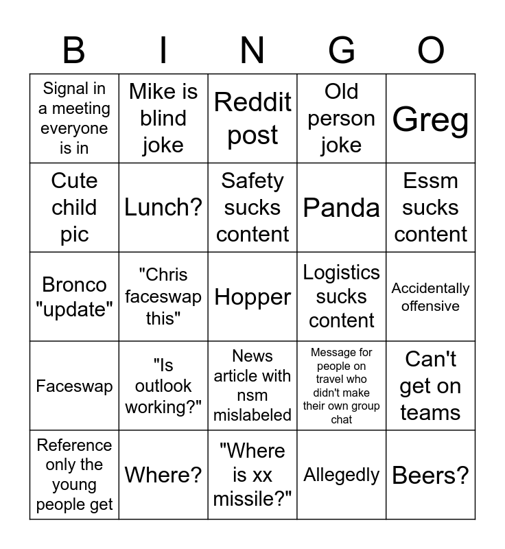 This bingo card has 40 words: Free!, Bronco "update", Terry content, Lunch?, Where?, News article with nsm mislabeled, Safety sucks content, Actual work related content, Greg, Faceswap, "Chris faceswap this", Old person joke, Hopper, Accidentally offensive, Logistics sucks content, "Is outlook working?", People send the same gif, Signal in a meeting everyone is in, Annoying ringtone, Reddit post, Can't get on teams, Allegedly, Panda, Cute child pic, Chipotle, Tifty, Punch Mike i saw a bronco, Lunch? Before 9am, Beers?, Message deleted, Reference only old people get, Reference only the young people get, Odds, Message for people on travel who didn't make their own group chat, Essm sucks content, "Where is xx missile?", No we're in "Conference room other than hopper", SpongeBob reference, Mike is blind joke and "Racist".