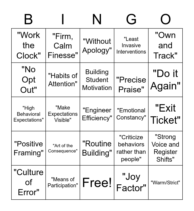 This bingo card has 29 words: "Culture of Error", "Threshold and Strong Start", "Make Expectations Visible", "Warm/Strict", "Work the Clock", "Without Apology", "Habits of Attention", "Art of the Consequence", "Emotional Constancy", "Means of Participation", "Exit Ticket", "Engineer Efficiency", Free!, "Joy Factor", "Do it Again", "Every Minute Matters", "Routine Building", "Positive Framing", "Own and Track", "High Behavioral Expectations", "Criticize behaviors rather than people", What to Do, "Precise Praise", "No Opt Out", "Least Invasive Interventions, "Firm, Calm Finesse", "Strong Voice and Register Shifts", Building Student Motivation and Reinforce Actions, Not Traits.