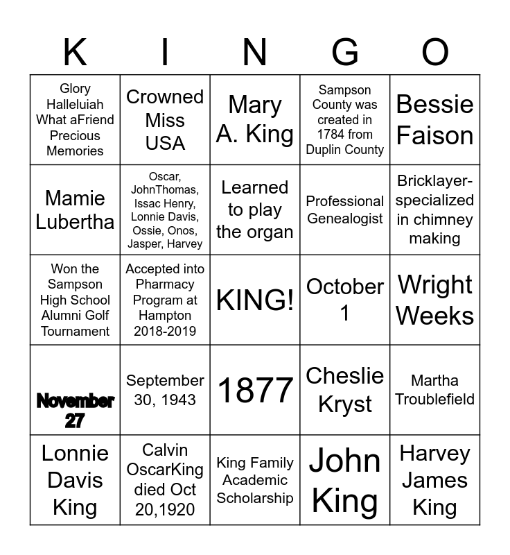 This bingo card has a free space and 62 words: Calvin King and Susan Mcphail married in 1877, Calvin OscarKing died Oct 20,1920, Susan Maltilda McPhaiil wife of Calvin Oscar King, November 27, Cedar Point Disciple Church, Caucasian King Family of Sampson County, Oscar, JohnThomas, Issac Henry, Lonnie Davis, Ossie, Onos, Jasper, Harvey, Issac and Lonnie married sisters, Professional Genealogist, Susan King died July 11,1925, Sampson County was created in 1784 from Duplin County, Wilbert Huff Royal 1948 - 1996, Mamie Lubertha, Calvin learned music from his slave owner, January 6, 1847, Glory Halleluiah What aFriend Precious Memories, Harvey James King, Bessie Faison, Started singing in a little wooden church, Learned to play the organ, October 1, Mary A. King, Lonnie Davis King, John King, George King, Mattie King, Charles King, Onas King born September 9, 1893, Martha Troublefield, Mary Troublefield, Gracie King, Killed in Cotton Gin in 1920, Headstone at Monk's Crossroad, Members at Cedar Point, Wright Weeks, Crowned Miss USA, Selected as a Great 100 Nurse in 2019, 13, Accepted into Pharmacy Program at Hampton 2018-2019, Sampson, Won the Sampson High School Alumni Golf Tournament, October 12, 1903, September 30, 1943, November 11, 1903, Bricklayer-specialized in chimney making, Cheslie Kryst, Katrina Peele Boykin James Peele, Linda M. Owens, Edna Ripley Peggy McCauley Lillie James Luretha McLean, 10, 1877, King Family Academic Scholarship, Accepted into Spelman Whitney Boykin, A Family Is Like A Circle, Played KINGO virtually, Mattie King Fryar Family 2022 KINGO Winners, David King, Jr. Family 2022 KINGO Winner, Tevin Wynn 2022 KINGO Winner, May 20, 1858, August 5, 2023, Western Sizzling and Dunn, NC.