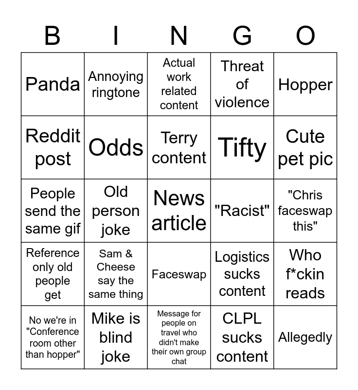 This bingo card has 42 words: Bronco "update", Terry content, Lunch?, Sam & Cheese say the same thing, CLPL sucks content, Who f*ckin reads, News article, Safety sucks content, Actual work related content, Faceswap, "Chris faceswap this", Cute pet pic, Old person joke, Hopper, Accidentally offensive, Logistics sucks content, "Is outlook working?", People send the same gif, Signal in a meeting everyone is in, Annoying ringtone, Reddit post, Can't get on teams, Allegedly, Panda, Cute child pic, Chipotle, Tifty, Punch Mike i saw a bronco, Lunch? Before 9am, Flightline?, Message deleted, Reference only old people get, Odds, Message for people on travel who didn't make their own group chat, "Where is xx missile?", No we're in "Conference room other than hopper", Mike is blind joke, "Racist", "Approved", RMD sucks content, Threat of violence and Gavin's truck update.