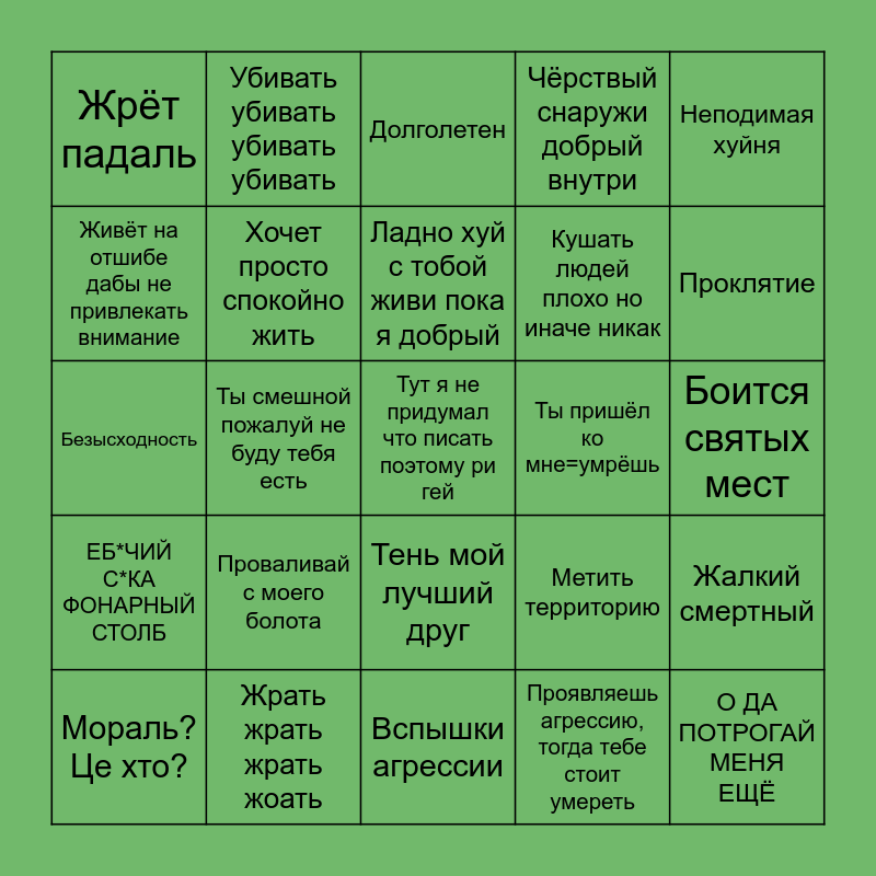 This bingo card has a free space and 24 words: Проваливай с моего болота, Жрать жрать жрать жоать, Ладно хуй с тобой живи пока я добрый, Мораль? Це хто?, Неподимая хуйня, Жрёт падаль, Живёт на отшибе дабы не привлекать внимание, Убивать убивать убивать убивать, Ты пришёл ко мне=умрёшь, Тень мой лучший друг, Кушать людей плохо но иначе никак, Безысходность, Метить территорию, Жалкий смертный, Хочет просто спокойно жить, Проявляешь агрессию, тогда тебе стоит умереть, Боится святых мест, Долголетен, Проклятие, Ты смешной пожалуй не буду тебя есть, О ДА ПОТРОГАЙ МЕНЯ ЕЩЁ, ЕБ*ЧИЙ С*КА ФОНАРНЫЙ СТОЛБ, Чёрствый снаружи добрый внутри and Вспышки агрессии.