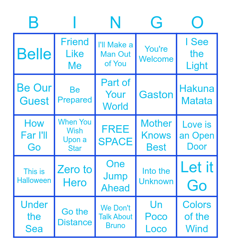 This bingo card has a free space and 24 words: Zero to Hero, Go the Distance, Part of Your World, Under the Sea, I See the Light, Belle, Be Our Guest, Friend Like Me, Mother Knows Best, One Jump Ahead, Gaston, How Far I'll Go, Into the Unknown, Let it Go, Be Prepared, Un Poco Loco, Love is an Open Door, I'll Make a Man Out of You, Hakuna Matata, When You Wish Upon a Star, Colors of the Wind, This is Halloween, You're Welcome and We Don't Talk About Bruno.
