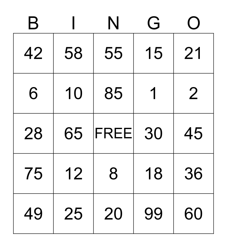 This bingo card has a free space and 24 words: 12, 25, 85, 49, 21, 42, 6, 58, 30, 8, 1, 28, 18, 36, 10, 99, 45, 55, 2, 65, 60, 75, 15 and 20.
