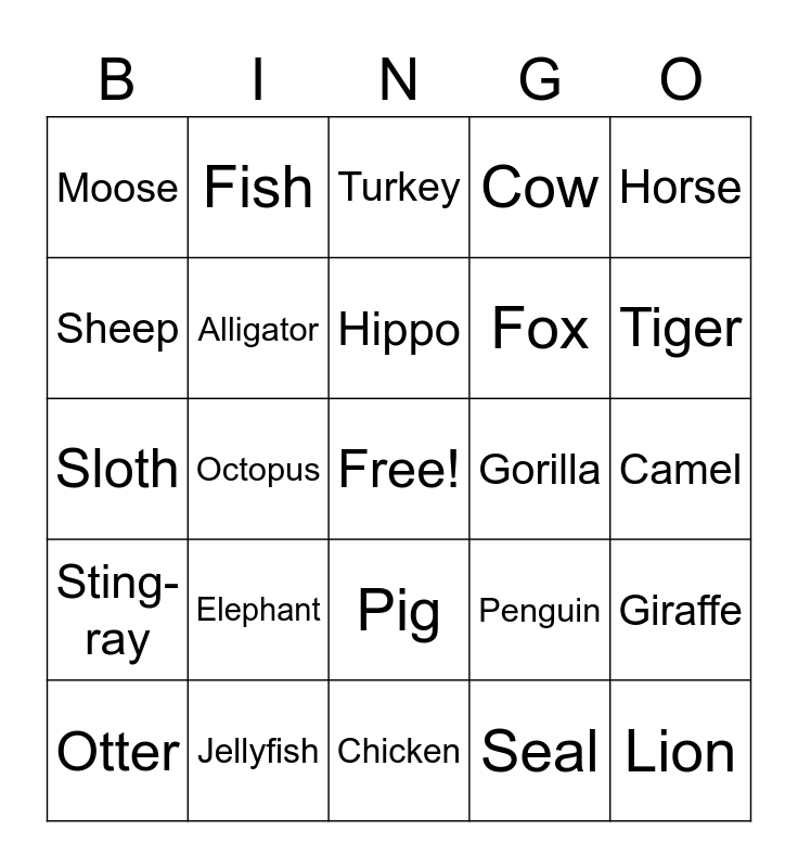 This bingo card has a free space and 24 words: Elephant, Jellyfish, Hippo, Otter, Horse, Moose, Sheep, Fish, Gorilla, Pig, Fox, Sloth, Penguin, Giraffe, Alligator, Seal, Camel, Turkey, Tiger, Octopus, Lion, Sting-ray, Cow and Chicken.