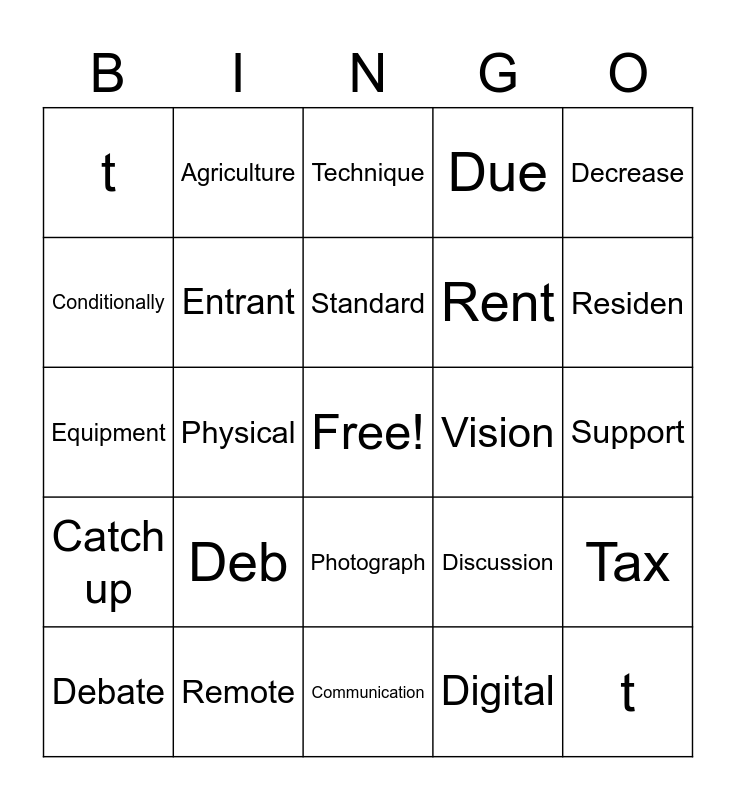 This bingo card has a free space and 36 words: Increase, Bright-eyed, Previous, Entrant, Discussion, Catch up, Standard, Mental, Decrease, Improve, Physical, Due, Peer, Vision, Residen, t, Contest, Deb, t, Technique, Support, Tax, Remote, Debate, Communication, Agriculture, Equipment, Alarm clock, Rent, Conditionally, Skim off, Unpublished, Digital, Photograph, Struggle and Foggy brain.
