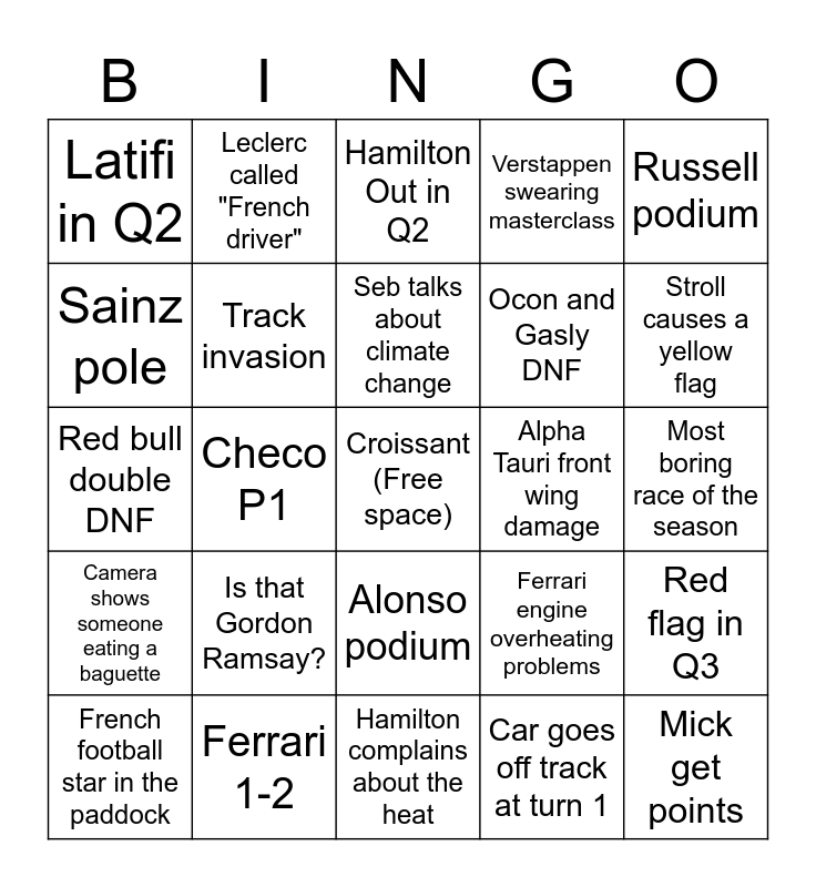 This bingo card has a free space and 24 words: French football star in the paddock, Is that Gordon Ramsay?, Seb talks about climate change, Car goes off track at turn 1, Russell podium, Latifi in Q2, Leclerc called "French driver", Hamilton Out in Q2, Alpha Tauri front wing damage, Most boring race of the season, Red bull double DNF, Track invasion, Ferrari engine overheating problems, Red flag in Q3, Sainz pole, Ferrari 1-2, Hamilton complains about the heat, Verstappen swearing masterclass, Stroll causes a yellow flag, Camera shows someone eating a baguette, Checo P1, Alonso podium, Ocon and Gasly DNF and Mick get points.
