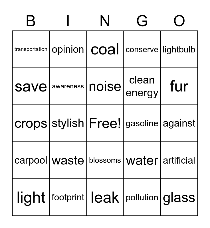 This bingo card has a free space and 60 words: Carbon, footprint, fuel, carpool, pollution, emission, awareness, soil, clean energy, fossil, conserve, recycle, save, plant, meat, transportation, glass, lightbulb, problem, noise, gasoline, coal, light, artificial, animals, reuse, vegetarian, vegan, fur, coat, zoo, danger, endangered, species, opinion, leather, cruel, stylish, confined, crops, wasteful, waste, against, environment, water, nuclear, seaweed, caviar, skip, blossoms, leak, radioactive, evacuate, population, human beings, life, wind, politics, community and Don't litter.