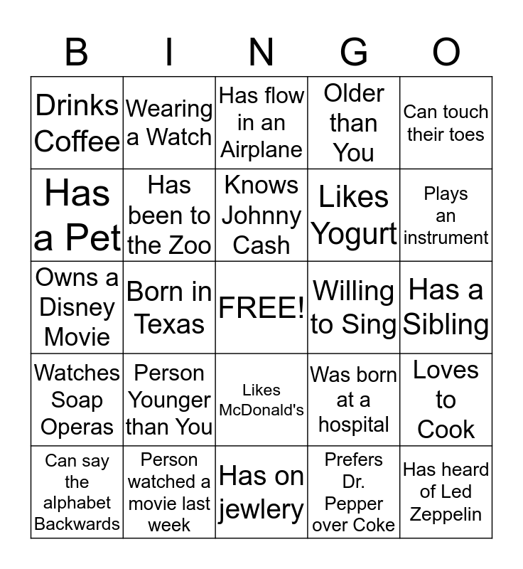 This bingo card has a free space and 24 words: Person Younger than You, Person watched a movie last week, Knows Johnny Cash, Can say the alphabet Backwards, Can touch their toes, Drinks Coffee, Has a Pet, Wearing a Watch, Willing to Sing, Likes McDonald's, Likes Yogurt, Owns a Disney Movie, Was born at a hospital, Loves to Cook, Has been to the Zoo, Prefers Dr. Pepper over Coke, Has a Sibling, Has flow in an Airplane, Plays an instrument, Born in Texas, Has heard of Led Zeppelin, Watches Soap Operas, Older than You and Has on jewlery.