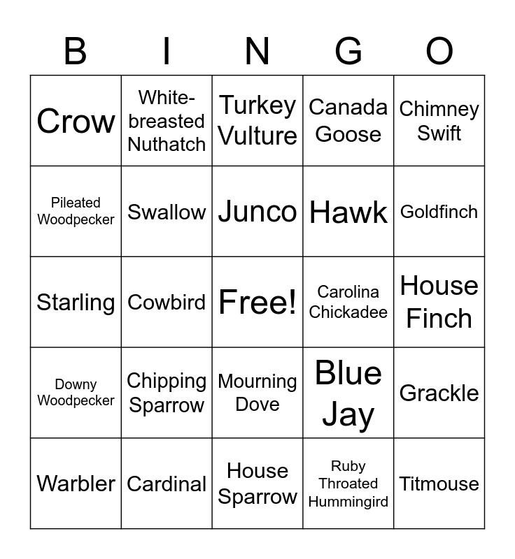 This bingo card has a free space and 30 words: Cardinal, Wren, Cowbird, Catbird, Crow, Turkey Vulture, Swallow, Mourning Dove, Carolina Chickadee, House Sparrow, House Finch, Titmouse, Ruby Throated Hummingird, Robin, Goldfinch, Song/Field Sparrow, Blue Jay, Downy Woodpecker, Chipping Sparrow, Chimney Swift, Starling, Red-winged Blackbird, White-breasted Nuthatch, Hawk, Pileated Woodpecker, Canada Goose, Grackle, Warbler, Junco and Barn Swallow.