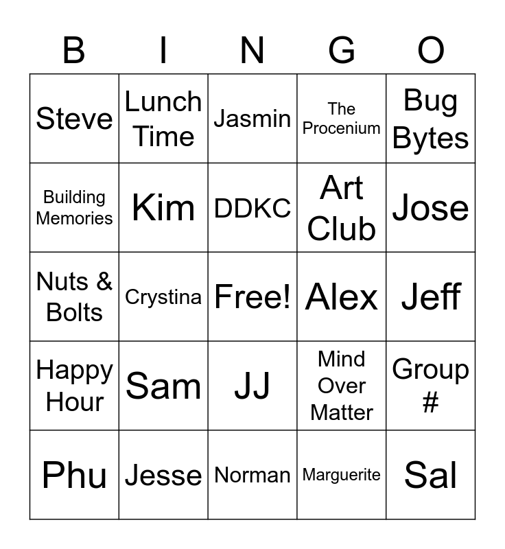 This bingo card has a free space and 29 words: Phu, Perla, Crystina, Eric, Steve, Jasmin, Kim, Sam, Alex, Jesse, Jeff, Sal, Norman, Marguerite, Jose, Juliette, JJ, Happy Hour, Bug Bytes, Nuts & Bolts, Mind Over Matter, Turnip The Heat, Art Club, Building Memories, The Procenium, Lunch Time, Group #, DDKC and Summer.