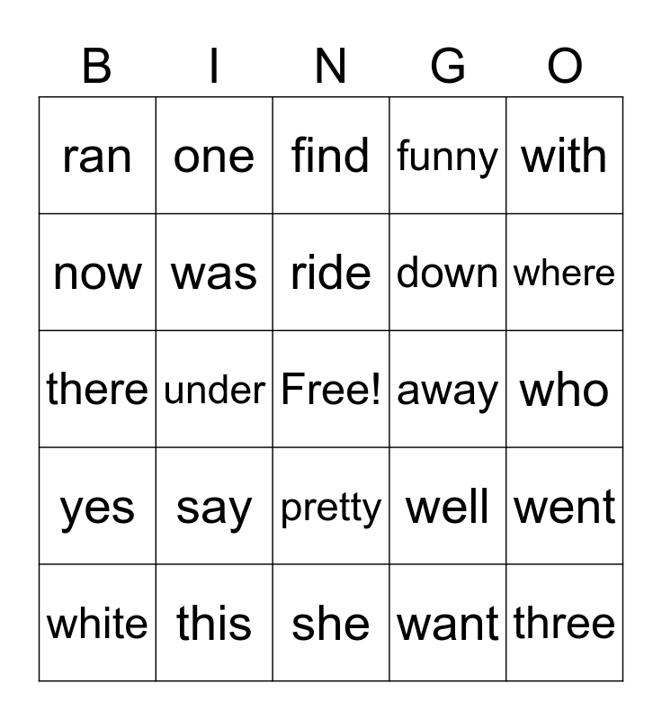 This bingo card has a free space and 24 words: say, this, ride, white, with, ran, now, one, away, pretty, down, there, well, went, was, want, who, find, where, under, three, yes, funny and she.