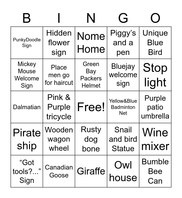 This bingo card has a free space and 40 words: Superman flag, Dalmatian, The 7 dwarfs statues, Place men go for haircut, Canadian Goose, Rusty dog bone, Green Bay Packers Helmet, A face in Bird House, Unique Blue Bird, Pirate ship, Pink & Purple tricycle, Piggy’s and a pen, Bumble Bee Can, Purple patio umbrella, Yellow&Blue Badminton Net, Wooden wagon wheel, Blue bird in a tree, PunkyDoodle Sign, Really BIG tortoise, Nome Home, Wine mixer, Owl house, Bluejay welcome sign, Mickey Mouse Welcome Sign, 3 Dolphins in a tree, Plant men, Siamese cat statue, Boston Bruins sign, Bird waterfall, Unicorn, Golden Shrimp flower, “Got tools?...” Sign, 2 wooden Face Masks, Snail and bird Statue, Stop light, Giraffe, The Great Escape, A car stuck in the fence, Hidden flower sign and Little word LAKE.