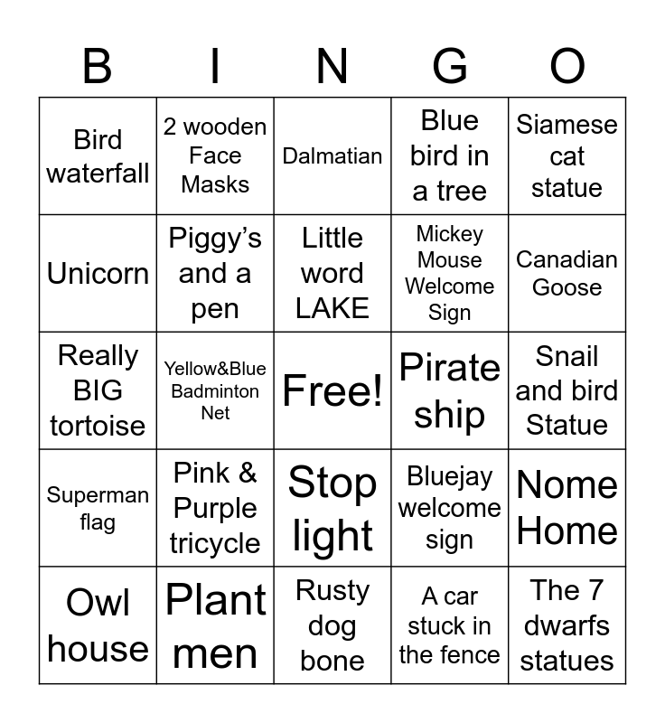 This bingo card has a free space and 26 words: Stop light, A car stuck in the fence, Little word LAKE, Plant men, Siamese cat statue, Bird waterfall, Unicorn, 2 wooden Face Masks, Snail and bird Statue, Bluejay welcome sign, Mickey Mouse Welcome Sign, Really BIG tortoise, Nome Home, Owl house, Yellow&Blue Badminton Net, Wooden wagon wheel, Blue bird in a tree, Superman flag, Dalmatian, The 7 dwarfs statues, Canadian Goose, Rusty dog bone, Pirate ship, Pink & Purple tricycle, Piggy’s and a pen and Purple patio umbrella.