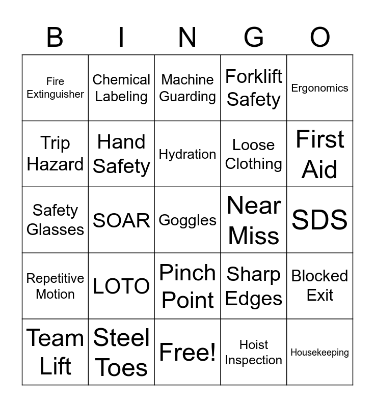This bingo card has 31 words: Free!, Spill Kit, SOAR, Hazard Identification, Fire Extinguisher, Machine Guarding, Hand Safety, Sharp Edges, Near Miss, Hoist Inspection, SDS, Goggles, Housekeeping, PPE, First Aid, Exit Routes, Blocked Exit, LOTO, Repetitive Motion, Pinch Point, Ergonomics, Ear Plugs, Team Lift, Chemical Labeling, Loose Clothing, Trip Hazard, Forklift Safety, Safety Glasses, Steel Toes, Hydration and Fire Suppression.